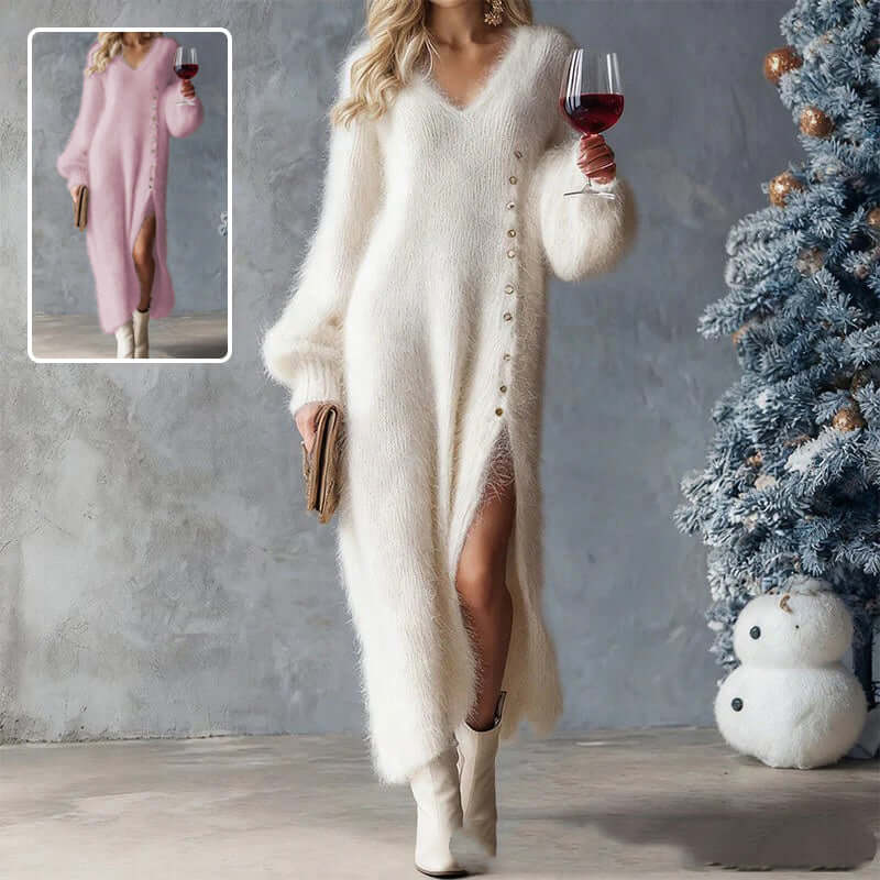 Chic Split Knitted Dress With Buttons Design Winter V-Neck Fleece Maxi Dresses Evening Party Club Fashion Women's Clothing