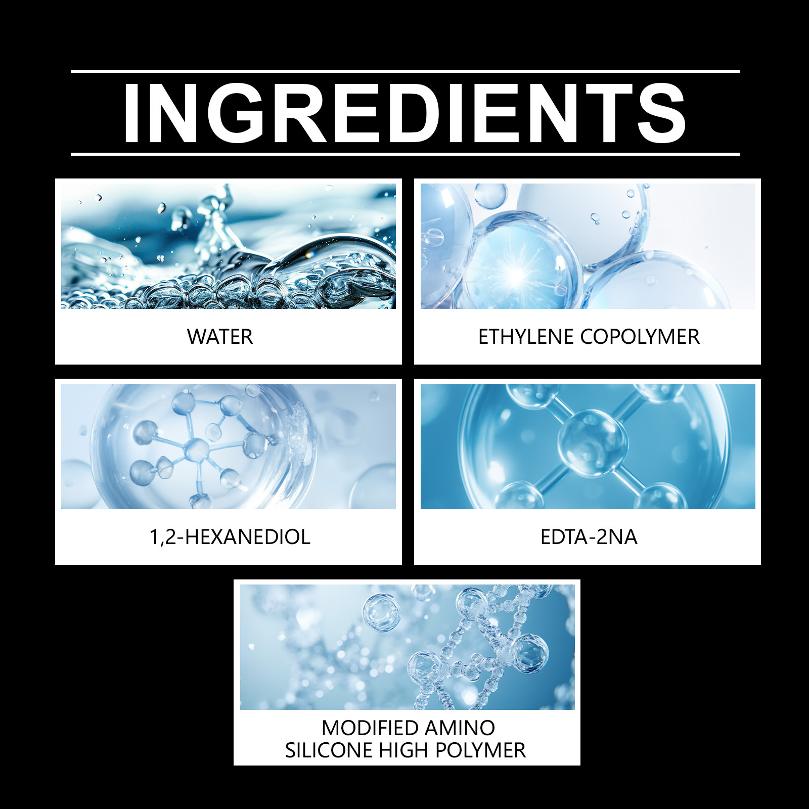 Ingredients: water, modified amino silicone oil polymer, ethylene copolymer, 1,2- hexanediol, EDTA-2Na.