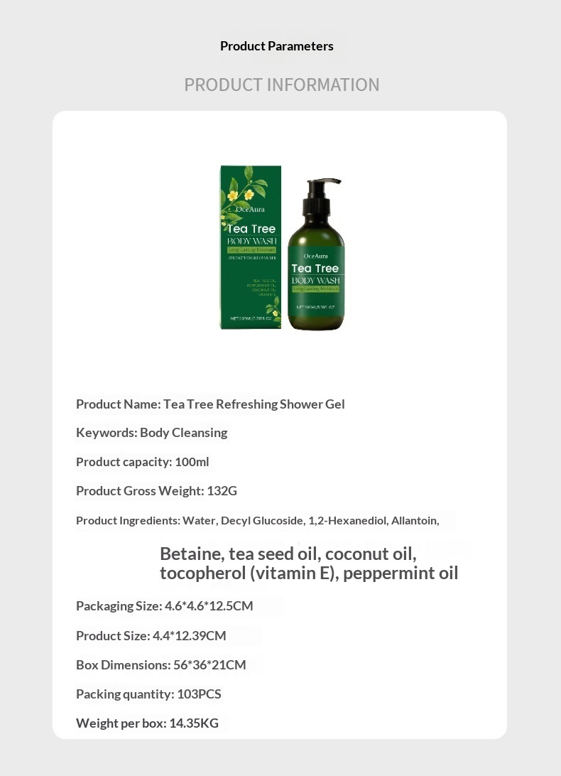 Indulge your skin with our Moisturizing Refreshing Tea Tree Body Wash, expertly formulated to cleanse while nourishing. Infused with tea tree's natural clarifying properties, this sophisticated blend gently removes impurities without stripping away essential moisture. The hydrating formula soothes and softens, leaving your skin feeling refreshed, balanced, and luxuriously smooth. Perfect for daily use, it transforms your shower into a spa-like ritual of self-care and rejuvenation.